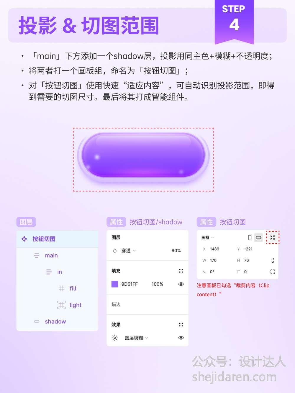 对「按钮切图」使用快速“适应内容”,可自动识别投影范围,即得到需要的切图尺寸。最后将其打成智能组件。