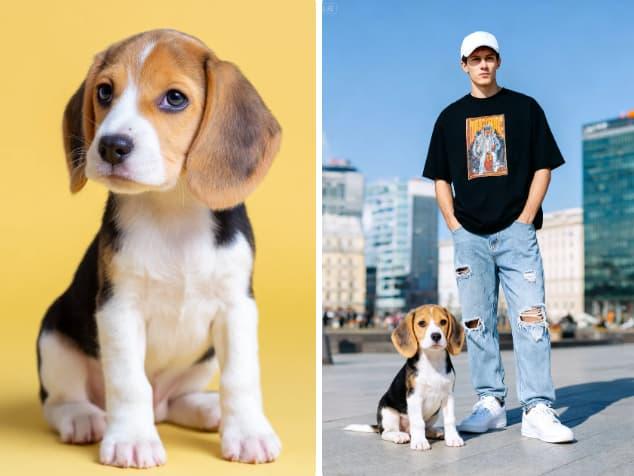 让图一男人换上图二的衣服,将滑板换成图三的小狗。