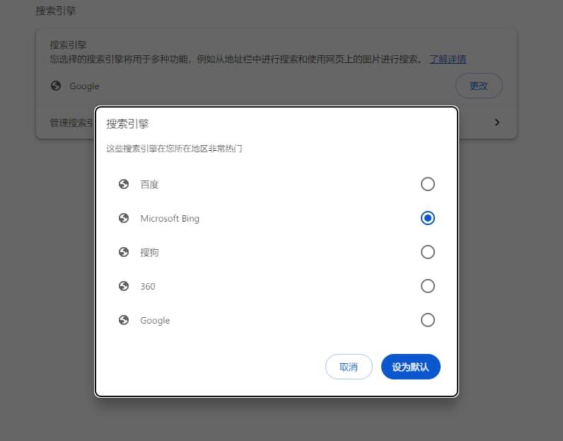 在设置页面,把默认的搜索引擎改为你喜欢的即可。