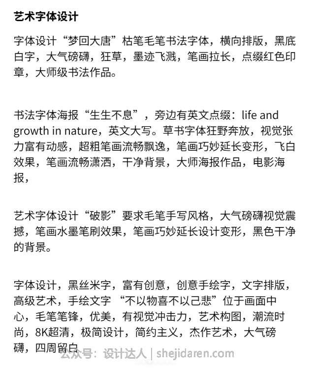 以上分享的提示词都可以生成毛笔书法艺术字效果,直接把提示词粘贴到豆包或者即梦AI即可,设计达人是使用豆包测试,效果还可可以哦。以上就是今天的AI教程分享,感谢阅读。