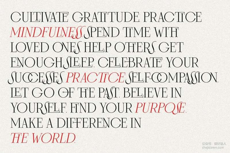 衬线设计的常规和斜体款时尚优雅又高级,bold 和粗斜体还带额外曲线,复古感直接拉满,做设计的时候风格切换超灵活!每个版本还有 25 + 小写连字和大写手写替代字形,细节控狂喜🥰